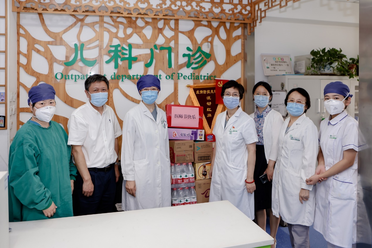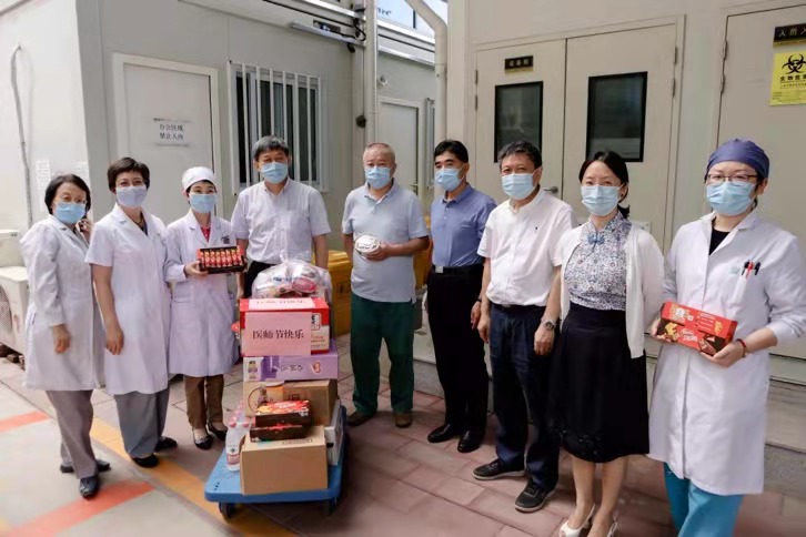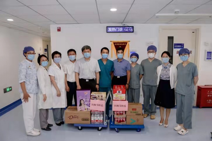 院领导与医务人员亲切交谈,给大家发放慰问品,感谢大家坚守疫情防控一线所付出的辛劳,向他们致以医师节的问候。院领导强调,疫情发生以来,全院医务工作者同时间赛跑、与病魔较量,凝心聚力战疫情,以实际行动诠释了“生命至上、人民至上”的崇高理念,赢得了全社会的高度赞誉,是一线战场的英雄、是新时代最可爱的人。疫情常态化防控时期,更要时刻保持高度的责任心,更加严谨细致地把疫情防控工作做细做实,更好地服务患者。同时叮嘱大家,做好个人防护,高温岗位科学调配工作时间,做好安全生产和防暑降温工作,保障职工身心健康。