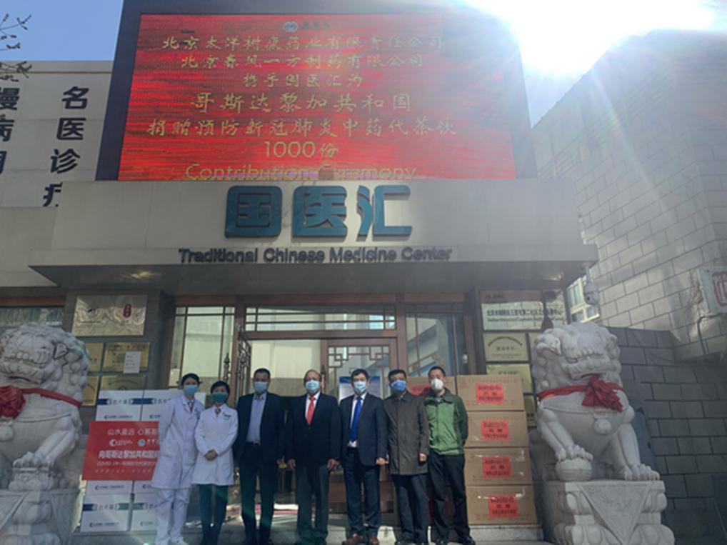 2020年3月27日上午,朝阳区驻华使节中医药健康服务基地、北京市朝阳区三里屯第二社区卫生服务中心(国医汇)携手两家朝阳区中药饮片教学实践基地、朝阳区中医协会常务理事单位北京太洋树康药业有限责任公司和北京春风一方制药有限公司向哥斯达黎加共和国各捐赠新冠肺炎中药预防代茶饮500人份(3000袋)。