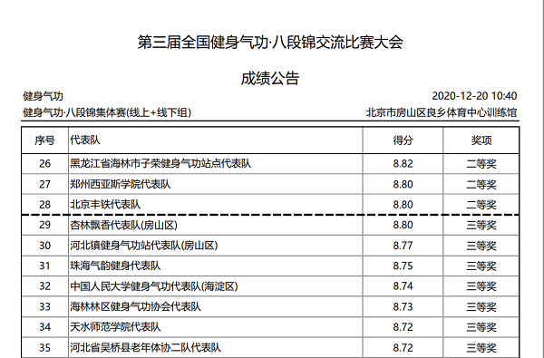 2020年12月20日,第三届全国健身气功·八段锦交流比赛大会在房山区良乡体育中心隆重举办,共计线上32支代表队、线下组24支代表队参赛。我院医保办孙志新、治未病科文银萍、肿瘤科赵丹、针灸科曾莹、药剂科隗仙5名队员组成"杏林飘香"代表队参与线下组现场比赛。