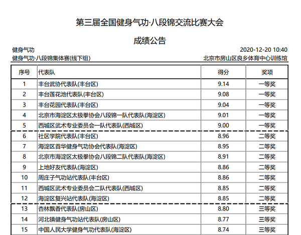 赛前,曾在我院进行八段锦教学的付锋老师、刘葆郁老师还对队员进行了进一步指导和纠正,为队员们加油鼓劲。第一次参加八段锦比赛、第一次参加全国级别的比赛、第一组上场,这一系列的第一使得5名队员每个人都倍感压力,但是她们沉着冷静应赛,一举获得线下组、线上加线下组三等奖,在房山区4支参赛队伍中名列第一。
