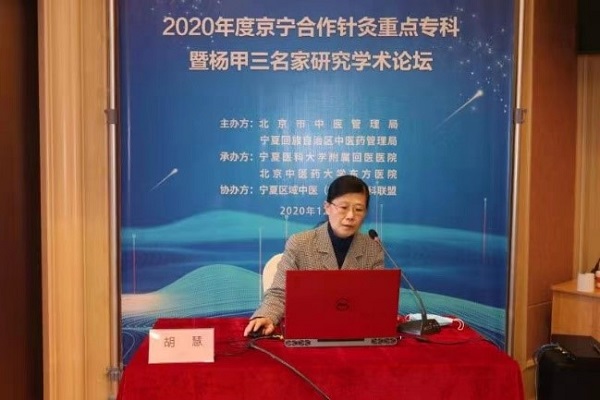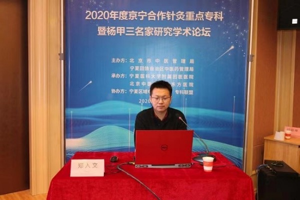 北京中医药大学东方医院拓展部副主任闫剑坤在"2020年度京宁合作针灸重点专科暨杨甲三名家研究室学术论坛"上致辞。针灸科主任胡慧教授代表杨甲三名家研究室总站赠送由杨甲三弟子,北京中医药大学80多岁老教授耿恩广亲笔题写的"尊师重道"牌匾,胡教授说,希望同仁们深刻理解这四个字,尊师就是要继承好老前辈的思想精华,重道是希望我辈同道在继承前辈的"术"的基础上更要继承好前辈的道义,只有有了高尚的道义才能真正继承和发扬好"术"。