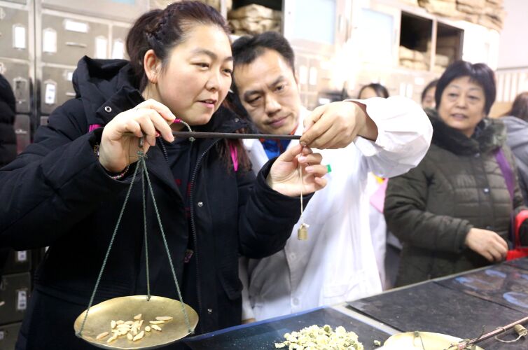 不大的中药房里,一个个小格子上写满了枸杞、金银花、地黄、陈皮、胖大海等中药名称,几位居民手拿戥子,在小格子间忙碌着。大家有模有样,俨然一副中医模样。“您这一把金银花不多不少,正好15g!”一旁的中药师不禁对居民的“一把抓”竖起了大拇指。