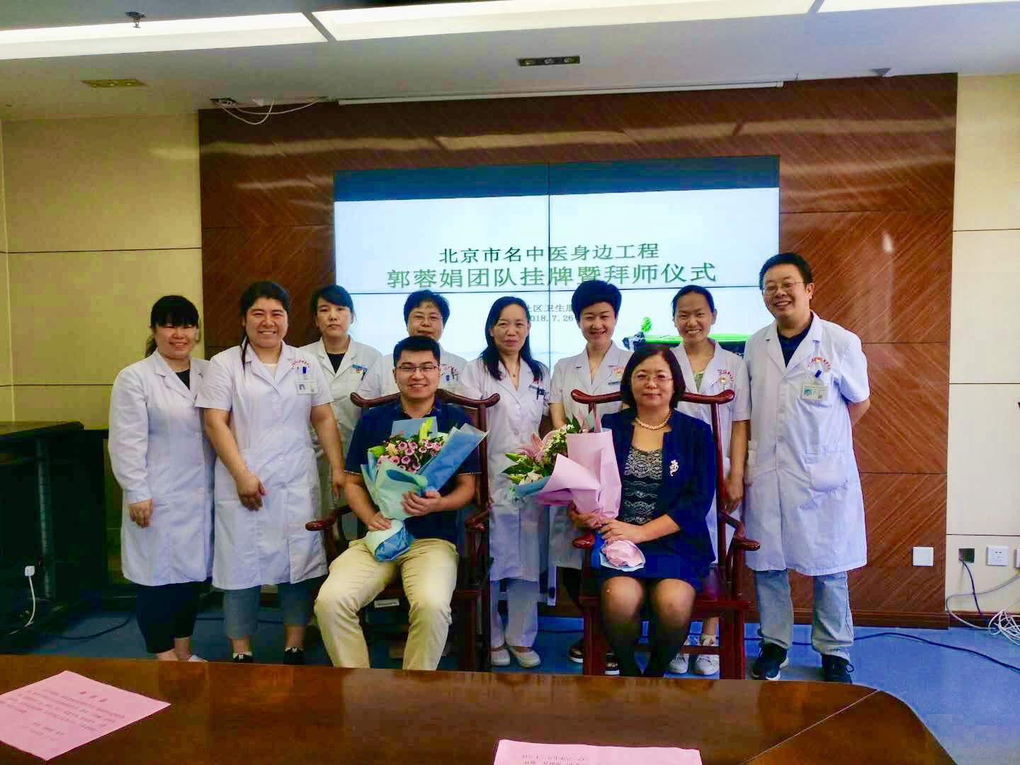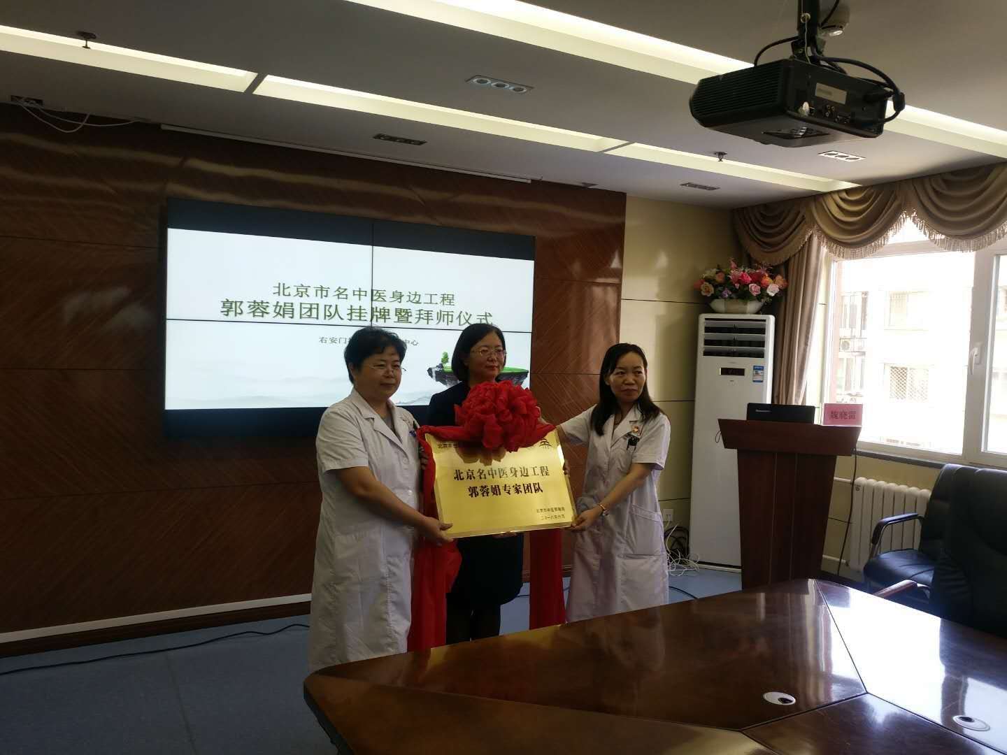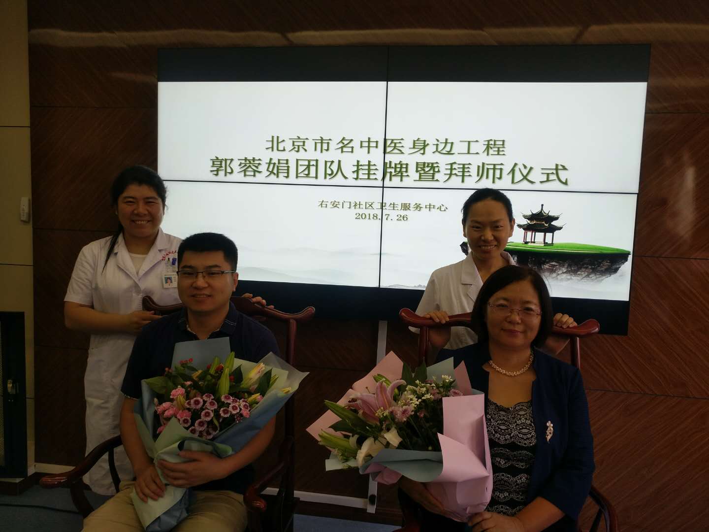 2018年7月25日,北京名中医身边工程郭蓉娟团队于右安门社区卫生服务中心举行了挂牌暨拜师仪式,参加仪式的有团队成员北京中医药大学东方医院郭蓉娟副院长、王嘉麟副主任医师及社区卫生服务中心主任田凌、中医科主任王玲玲、中心书记魏晓雷、青年中医师及行政人员。仪式意味着名中医身边工程正式于右安门社区卫生服务中心启动,助力右安门社区卫生医疗建设,群众在社区也可享受到便捷、优质的医疗资源。