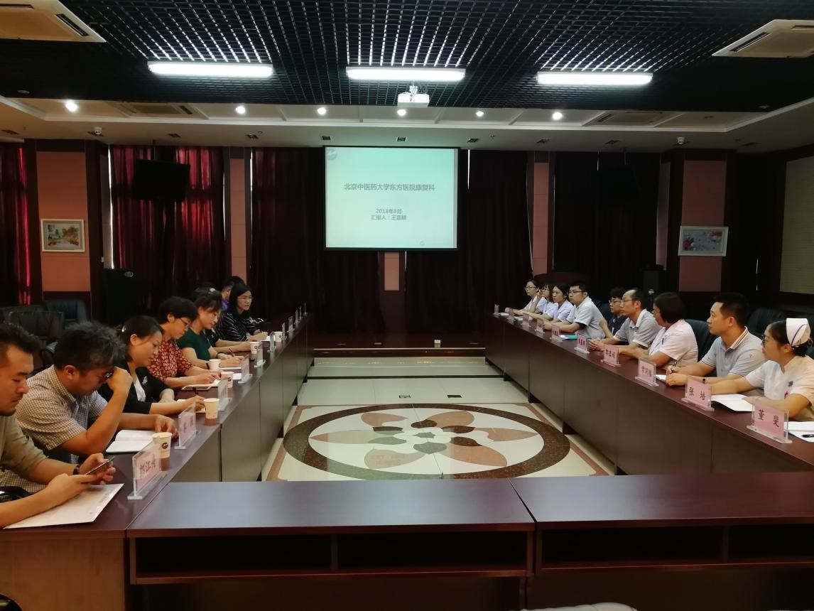 2018年8月31日上午,北京市三级医院康复医学科建设督导组来到北京中医药大学东方医院就康复医学科建设情况进行现场督导。康复督导组由北京市中医管理局林文慧主任带队,专家组由中国康复研究中心北京博爱医院主任医师孙迎春、北京中医药大学第三附属医院主任医师秦丽娜、北京市丰台中西医结合医院副主任医师黄乃好、首都医科大学附属北京中医医院副主任医师田伟、北京中医药大学东直门医院东区副主任医师张丽萍组成。丰台卫计委副主任曹苁、丰台卫计委妇幼老年康复工作负责人刘小瑜、丰台铁营医院院长刘继霞、铁营医院副院长郭强参加了现场督导。我院党委书记李晨辉、副院长郭蓉娟、护理部主任焦蕴岚、医务处常洞赜、康复科负责人王嘉麟及康复科相关人员出席迎接督查指导工作。