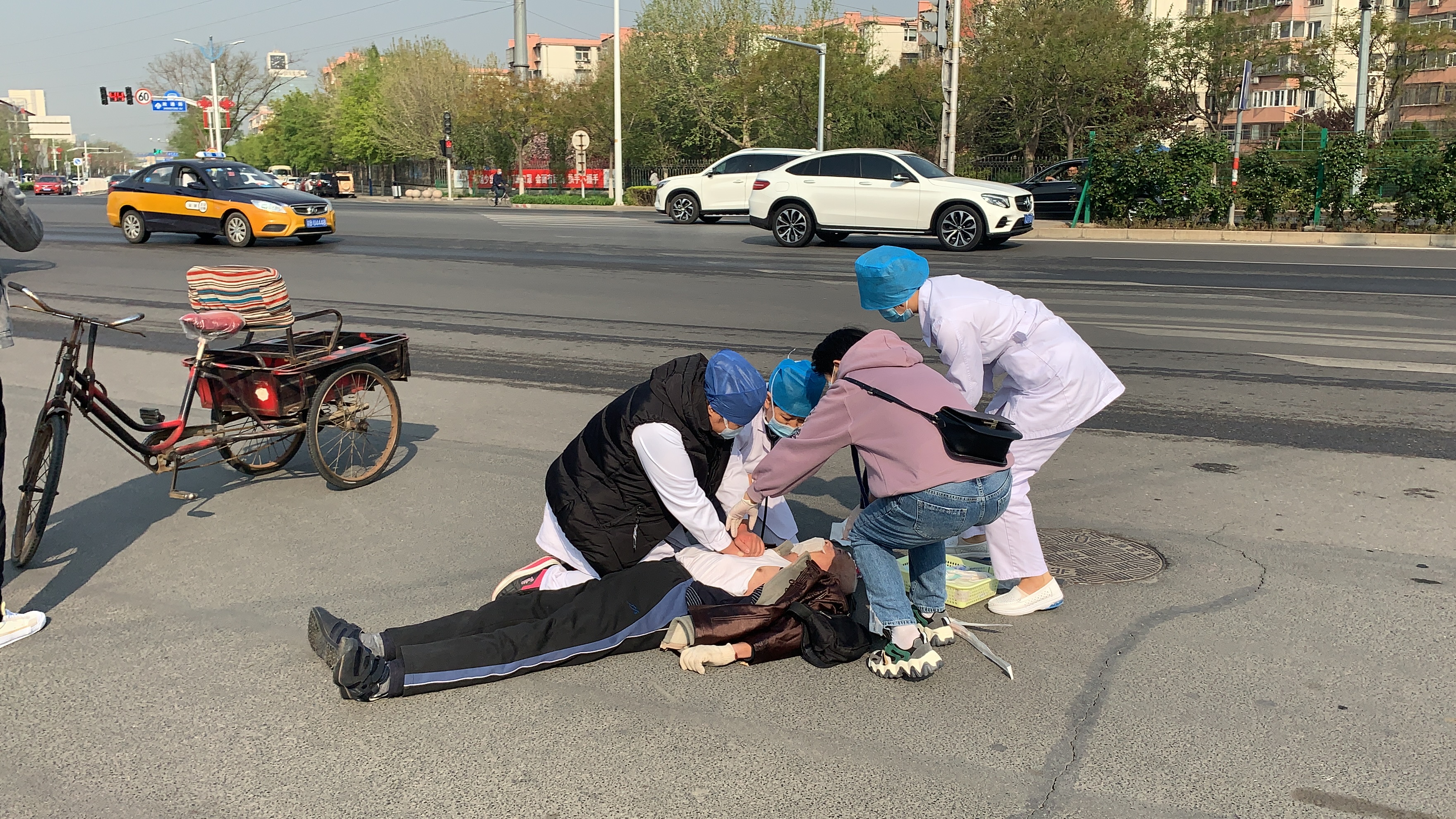 4月14日早上8点多钟,北京中医药大学房山医院月华分院的医护人员正在井然有序的忙碌着,正在这时候,突然大门口有路人大喊:"路口有人晕倒了!"