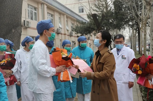 3月9日,北京市丰台区卫生健康委党委书记、主任刘婉莹、办公室主任项娜至北京市丰台中西医结合医院慰问下线医务人员,北京市丰台中西医结合医院党委书记王振涛、院长麻永怀、副书记蒋红岩、副院长吴业清、许鑫、刘秀茹陪同。