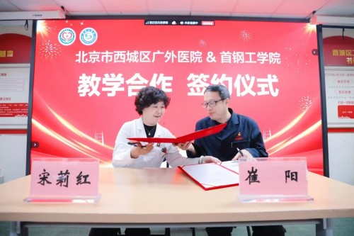 会上,广外医院党委副书记、院长宋莉红与首钢工学院党委副书记、院长崔阳共同签署《护理教学医院合作协议》,并为护理“教学医院”揭牌。