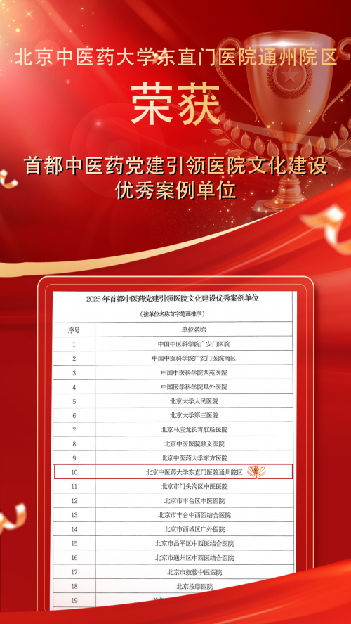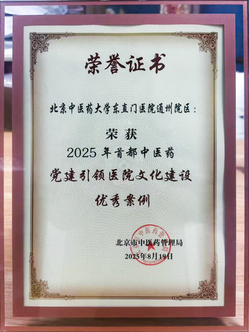 2025年8月19日,北京市中医药管理局组织全市中医药系统组织开展第六个“中国医师节”庆祝活动。弘扬“敬佑生命、救死扶伤、甘于奉献、大爱无疆”的崇高职业精神,表彰先进,凝聚力量。会上,北京中医药大学东直门医院通州院区凭借在党建引领医院文化建设领域的突出成就与创新实践荣获“2025年首都中医药党建引领医院文化建设优秀案例单位”称号。