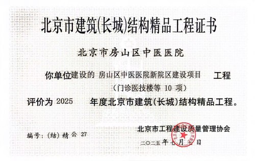 近日,由北京中医药大学房山医院负责建设的“房山区中医医院新院区建设项目(门诊医技楼等10项)”顺利通过北京市建设工程质量协会评审,荣获2025年度北京市建筑(长城)结构精品工程奖。这一荣誉标志着新院区工程在结构施工质量、技术创新与管理水平等方面均达到了北京市建筑业一流标准,为后续工程建设和医院高质量发展奠定了坚实基础。