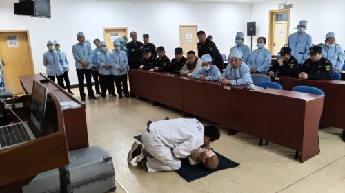 在理论讲解结束后,进入实操练习环节。保安和保洁人员热情高涨,纷纷踊跃参与,依次在模拟人身上进行心肺复苏操作练习。他们全神贯注,认真调整按压的力度和节奏,力求每一个动作都符合规范标准。林庚医师在旁耐心指导,及时纠正操作中存在的问题,并给予针对性的建议和鼓励,帮助大家更好地掌握急救技能。