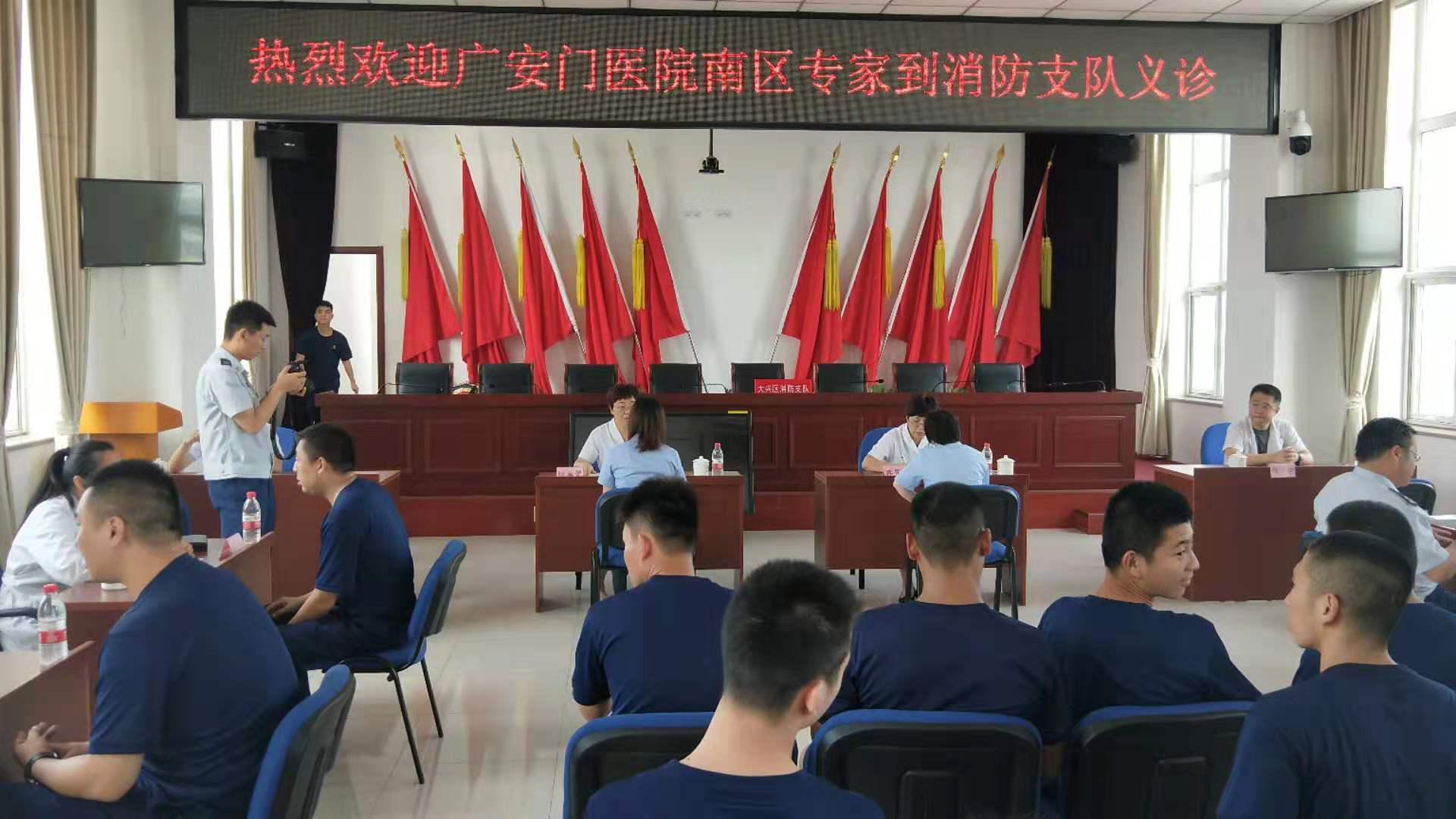 7月24日,广安门医院南区派出脑病科、心血管、脾胃病、骨科、外科、睡眠科、肛肠科、内分泌科专家赴大兴消防支队为坚守在工作岗位上的消防战士进行义诊服务和健康咨询。