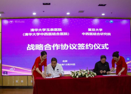 12月26日下午,清华大学玉泉医院(清华大学中西医结合医院)副院长冯兴中教授与复旦大学中西医结合研究院院长董竞成教授代表双方单位,共同签署战略合作协议。此次签约标志着两家单位将在中西医结合数智创新、内分泌专科建设、人才联合培养、临床科研协作等领域开启深度合作,为推动中西医结合学科高质量发展、探索医工交叉融合的实践路径注入新的合作动能。