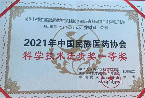 近日,中国民族医药协会2021年中国民族医药协会科学技术奖名单发布,北京市丰台中西医结合医院呼吸与危重症医学科主任乔树斌作为第一完成人申报的项目“痰热清对慢性阻塞性肺疾病急性加重期痰热壅肺证患者肠道微生物多样的影响”荣获科学技术奖一等奖。
