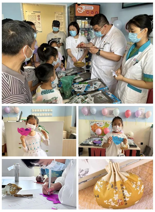 在药学部主管药师张旺的指导下,面对琳琅满目、色彩斑斓、千奇百怪的中药饮片,“小医师”们个个摩拳擦掌,跃跃欲试,想要亲手调配“独家秘方”的驱蚊香囊。“小医师”们一边制作香囊,一边听张老师讲解中草药传统知识和基本常识。来院小患者与家属,医院职工子女分别参加了系列活动。