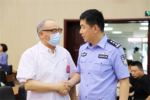 “凉风撤蒸暑,清云却炎晖”,2023年7月11日下午,国家级名老中医崔述生教授携崔述生全国名老中医药专家传承工作室团队来到北京市公安局东城分局,为公安干警的健康保驾护航。自2013年第一次开展这一活动起,崔述生教授工作室与东城分局形成了良好的默契,每年入伏,一如既往。北京市公安局东城分局党委委员、政治处主任任昶亮及政委邓向阳特意来到义诊活动现场慰问崔述生教授和工作室成员。本次义诊活动设有三伏贴贴敷、耳穴压丸疗法、推拿、脉诊多个模块,共惠及东城分局各个派出所及多个岗位民警180人次。